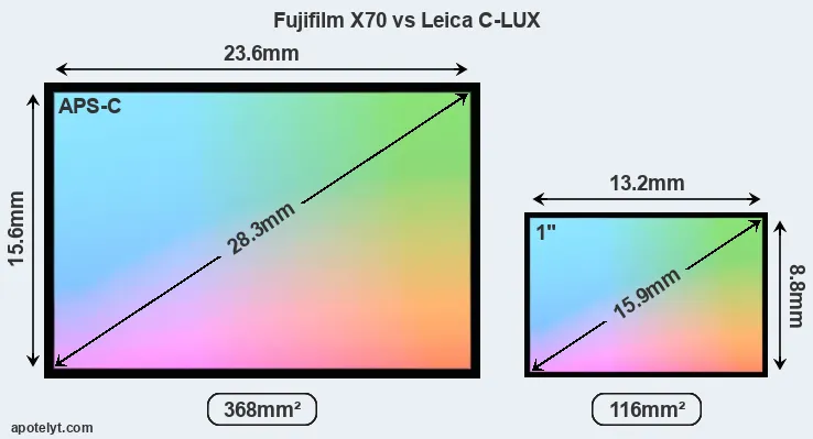 Of the two cameras under consideration, the Fujifilm X70 features an APS-C sensor and the Leica C-LUX an one-inch sensor. The sensor area in the C-LUX is 68 percent smaller. As a result of these sensor size differences, the cameras have a format factor of, respectively, 1.5 and 2.7. Both cameras have a native aspect ratio (sensor width to sensor height) of 3:2.