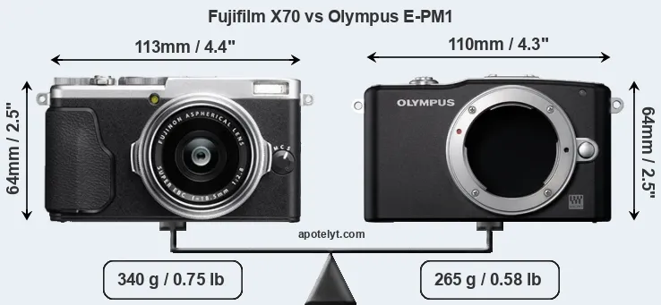 An illustration of the physical size and weight of the Fujifilm X70 and the Olympus E-PM1 is provided in the side-by-side display below. The two cameras are presented according to their relative size. Three successive views from the front, the top, and the rear are shown. All width, height and depth measures are rounded to the nearest millimeter.