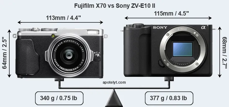 The physical size and weight of the Fujifilm X70 and the Sony ZV-E10 II are illustrated in the side-by-side display below. The two cameras are presented according to their relative size. Three consecutive perspectives from the front, the top, and the back are available. All width, height and depth measures are rounded to the nearest millimeter.