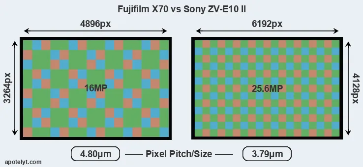 Despite having a slightly smaller sensor, the ZV-E10 II offers a higher resolution of 25.6 megapixels, compared with 16 MP of the X70. This megapixels advantage comes at the cost of a higher pixel density and a smaller size of the individual pixel (with a pixel pitch of 3.79μm versus 4.80μm for the X70). However, it should be noted that the ZV-E10 II is much more recent (by 8 years and 5 months) than the X70, and its sensor will have benefitted from technological advances during this time that make it possible to gather light more efficiently. Coming back to sensor resolution, it should be mentioned that the X70 has no anti-alias filter installed, so that it can capture all the detail its sensor resolves.
