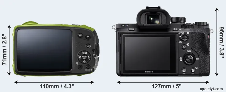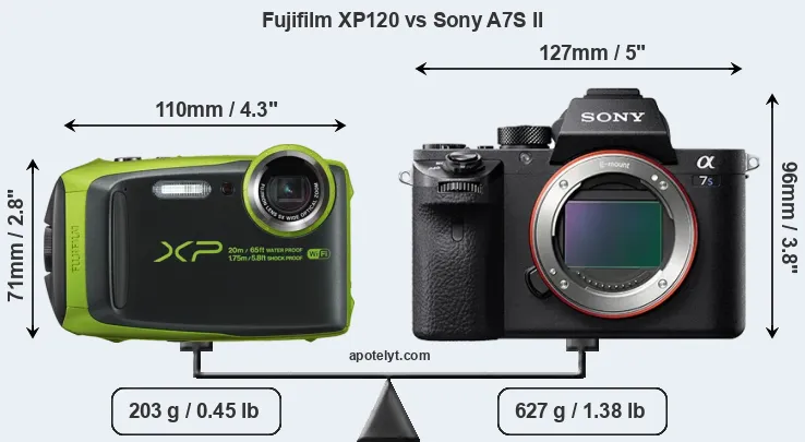 The side-by-side display below illustrates the physical size and weight of the Fujifilm XP120 and the Sony A7S II. The two cameras are presented according to their relative size. Three consecutive perspectives from the front, the top, and the back are available. All width, height and depth measures are rounded to the nearest millimeter.
