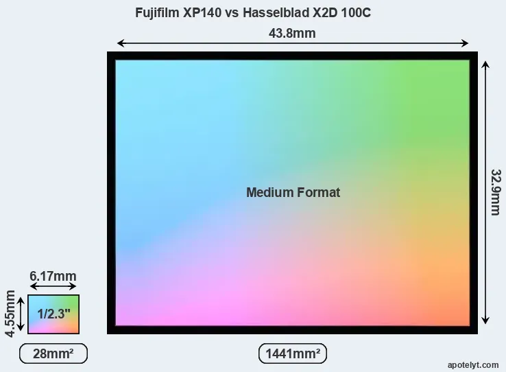 Of the two cameras under consideration, the Fujifilm XP140 features a 1/2.3-inch sensor and the Hasselblad X2D 100C a medium format sensor. The sensor area in the X2D 100C is 5046 percent bigger. As a result of these sensor size differences, the cameras have a format factor of, respectively, 5.6 and 0.79. Both cameras feature a native aspect ratio (sensor width to sensor height) of 4:3.