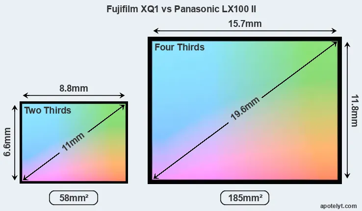 Of the two cameras under consideration, the Fujifilm XQ1 features a 2/3 sensor and the Panasonic LX100 II a Four Thirds sensor. The sensor area in the LX100 II is 219 percent bigger. As a result of these sensor size differences, the cameras have a format factor of, respectively, 3.9 and 2.2. Both cameras feature a native aspect ratio (sensor width to sensor height) of 4:3. The LX100 II has the particularity of featuring a switch that allows to toggle between multiple aspect ratios, while maintaining the same field of view and full image resolution.