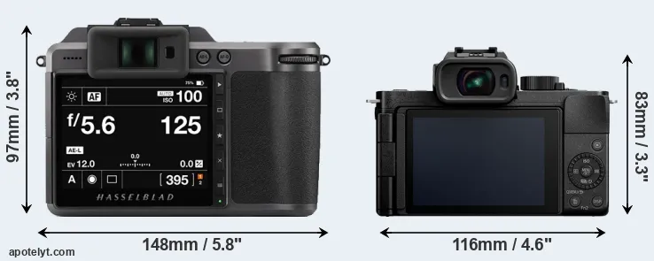 The side-by-side display below illustrates the physical size and weight of the Hasselblad X1D II and the Panasonic G110. The two cameras are presented according to their relative size. Three successive views from the front, the top, and the rear are shown. All size dimensions are rounded to the nearest millimeter.