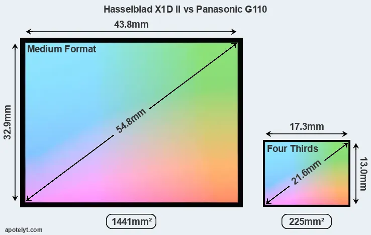 Of the two cameras under consideration, the Hasselblad X1D II features a medium format sensor and the Panasonic G110 a Four Thirds sensor. The sensor area in the G110 is 84 percent smaller. As a result of these sensor size differences, the cameras have a format factor of, respectively, 0.79 and 2.0. Both cameras feature a native aspect ratio (sensor width to sensor height) of 4:3.