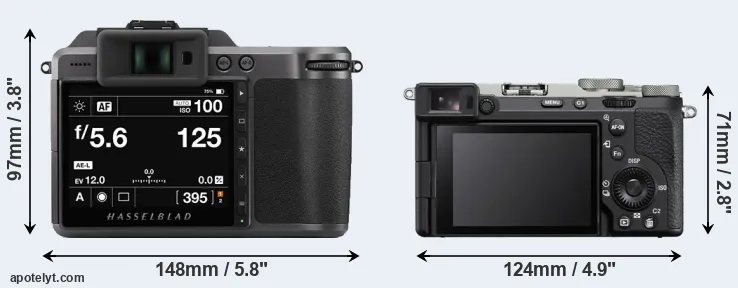 The side-by-side display below illustrates the physical size and weight of the Hasselblad X1D II and the Sony A7C II. The two cameras are presented according to their relative size. Three consecutive perspectives from the front, the top, and the back are available. All width, height and depth measures are rounded to the nearest millimeter.