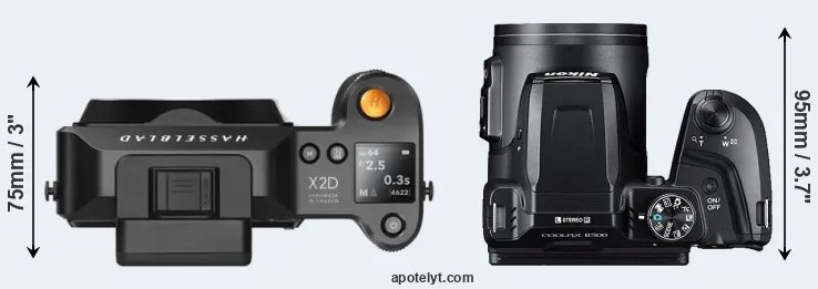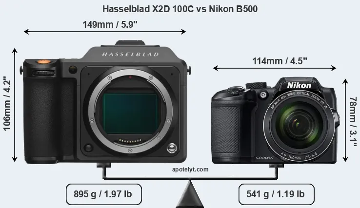 The physical size and weight of the Hasselblad X2D 100C and the Nikon B500 are illustrated in the side-by-side display below. The two cameras are presented according to their relative size. Three consecutive perspectives from the front, the top, and the back are available. All width, height and depth dimensions are rounded to the nearest millimeter.