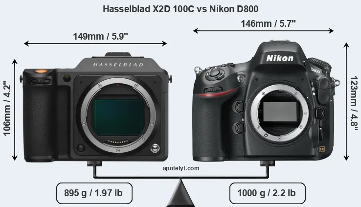 The side-by-side display below illustrates the physical size and weight of the Hasselblad X2D 100C and the Nikon D800. The two cameras are presented according to their relative size. Three consecutive views from the front, the top, and the rear side are shown. All width, height and depth dimensions are rounded to the nearest millimeter.