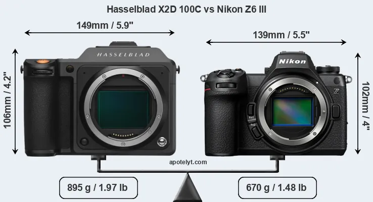 The physical size and weight of the Hasselblad X2D 100C and the Nikon Z6 III are illustrated in the side-by-side display below. The two cameras are presented according to their relative size. Three consecutive perspectives from the front, the top, and the back are available. All width, height and depth dimensions are rounded to the nearest millimeter.