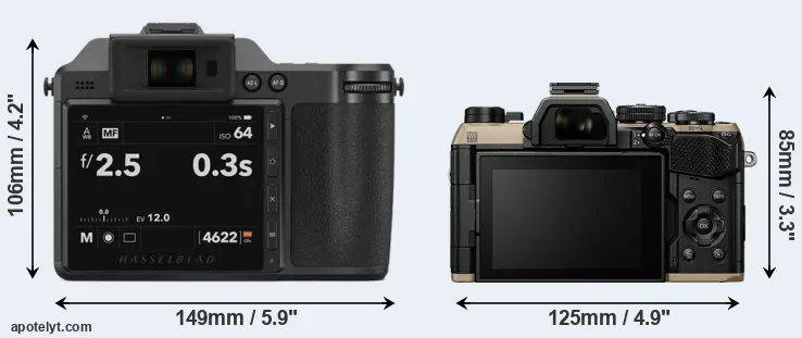The physical size and weight of the Hasselblad X2D 100C and the OM System OM-5 II are illustrated in the side-by-side display below. The two cameras are presented according to their relative size. Three consecutive views from the front, the top, and the rear side are shown. All size dimensions are rounded to the nearest millimeter.