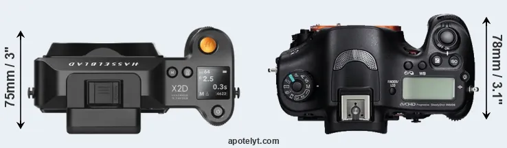 The physical size and weight of the Hasselblad X2D 100C and the Sony A99 are illustrated in the side-by-side display below. The two cameras are presented according to their relative size. Three consecutive views from the front, the top, and the rear side are shown. All size dimensions are rounded to the nearest millimeter.