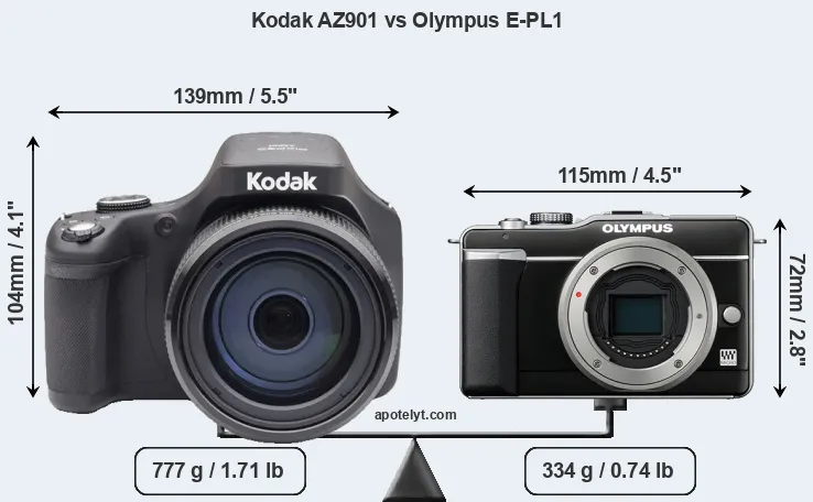 The physical size and weight of the Kodak AZ901 and the Olympus E-PL1 are illustrated in the side-by-side display below. The two cameras are presented according to their relative size. Three successive views from the front, the top, and the rear are shown. All width, height and depth measures are rounded to the nearest millimeter.
