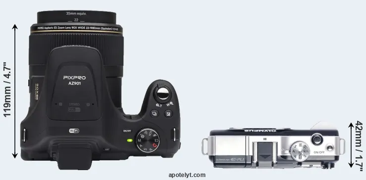The above size and weight comparisons are to some extent incomplete and possibly misleading, as the AZ901 has a lens built in, whereas the E-PL1 is an interchangeable lens camera that requires a separate lens. Attaching the latter will add extra weight and bulk to the setup. You can compare the optics available for the E-PL1 and their specifications in the Micro Four Thirds Lens Catalog.