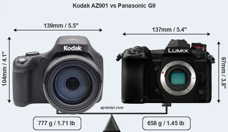 The side-by-side display below illustrates the physical size and weight of the Kodak AZ901 and the Panasonic G9. The two cameras are presented according to their relative size. Three consecutive perspectives from the front, the top, and the back are available. All width, height and depth measures are rounded to the nearest millimeter.