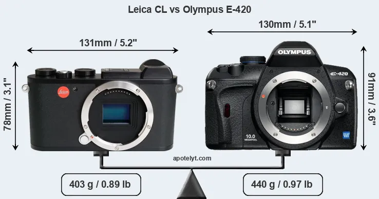 If the front view area (width x height) of the cameras is taken as an aggregate measure of their size, the Olympus E-420 is notably larger (16 percent) than the Leica CL. Moreover, the E-420 is markedly heavier (9 percent) than the CL. In this context, it is worth noting that neither the CL nor the E-420 are weather-sealed.