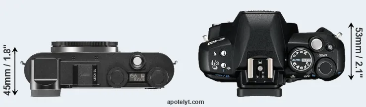 An illustration of the physical size and weight of the Leica CL and the Olympus E-420 is provided in the side-by-side display below. The two cameras are presented according to their relative size. Three consecutive perspectives from the front, the top, and the back are available. All size dimensions are rounded to the nearest millimeter.