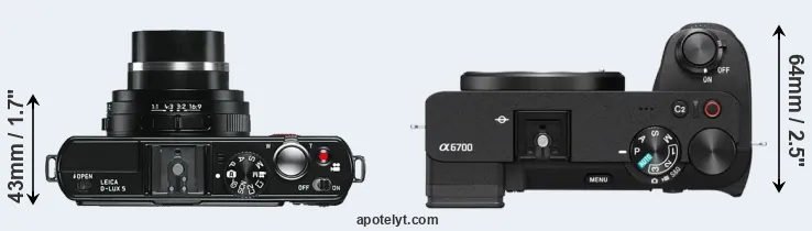 If the front view area (width x height) of the cameras is taken as an aggregate measure of their size, the Sony A6700 is notably larger (18 percent) than the Leica D-LUX 5. It is noteworthy in this context that the A6700 is splash and dust-proof, while the D-LUX 5 does not feature any corresponding weather-sealing.