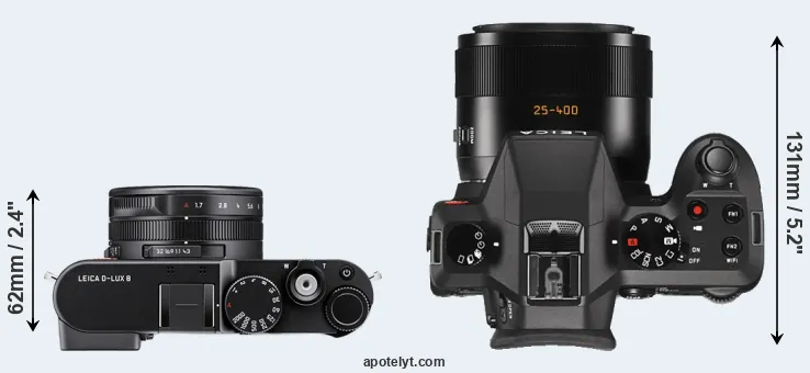 The physical size and weight of the Leica D-LUX 8 and the Leica V-LUX Typ 114 are illustrated in the side-by-side display below. The two cameras are presented according to their relative size. Three successive views from the front, the top, and the rear are shown. All width, height and depth measures are rounded to the nearest millimeter.