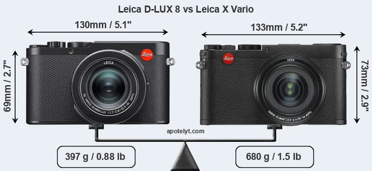 If the front view area (width x height) of the cameras is taken as an aggregate measure of their size, the Leica X Vario is notably larger (8 percent) than the Leica D-LUX 8. Moreover, the X Vario is substantially heavier (71 percent) than the D-LUX 8. In this context, it is worth noting that neither the D-LUX 8 nor the X Vario are weather-sealed.