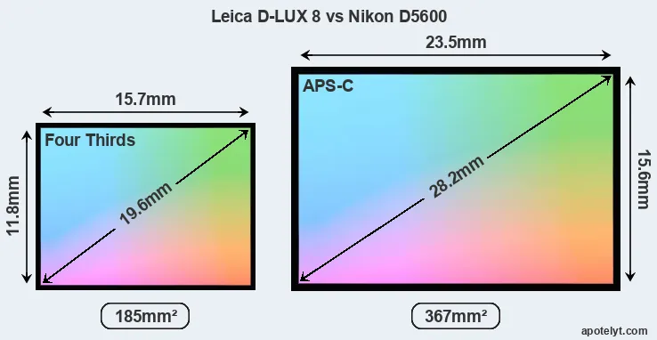 Of the two cameras under consideration, the Leica D-LUX 8 features a Four Thirds sensor and the Nikon D5600 an APS-C sensor. The sensor area in the D5600 is 98 percent bigger. As a result of these sensor size differences, the cameras have a format factor of, respectively, 2.2 and 1.5. The sensor in the D-LUX 8 has a native 4:3 aspect ratio, while the one in the D5600 offers a 3:2 aspect. The D-LUX 8 has the particularity of featuring a switch that allows to toggle between multiple aspect ratios, while maintaining the same field of view and full image resolution.