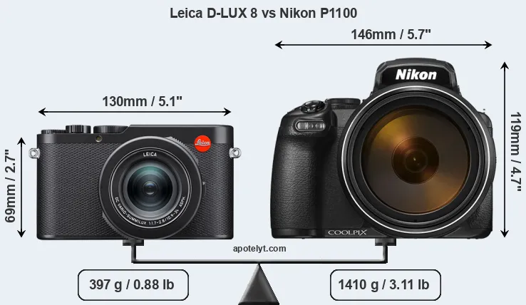 If the front view area (width x height) of the cameras is taken as an aggregate measure of their size, the Nikon P1100 is considerably larger (94 percent) than the Leica D-LUX 8. Moreover, the P1100 is substantially heavier (255 percent) than the D-LUX 8. In this context, it is worth noting that neither the D-LUX 8 nor the P1100 are weather-sealed.