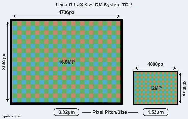 With 16.8MP, the D-LUX 8 offers a higher resolution than the TG-7 (12MP), but the D-LUX 8 nevertheless has larger individual pixels (pixel pitch of 3.32μm versus 1.53μm for the TG-7) due to its larger sensor. Moreover, the D-LUX 8 is a somewhat more recent model (by 9 months) than the TG-7, and its sensor might have benefitted from technological advances during this time that further enhance the light gathering capacity of its pixels. Coming back to sensor resolution, it should be mentioned that the D-LUX 8 has no anti-alias filter installed, so that it can capture all the detail its sensor resolves.