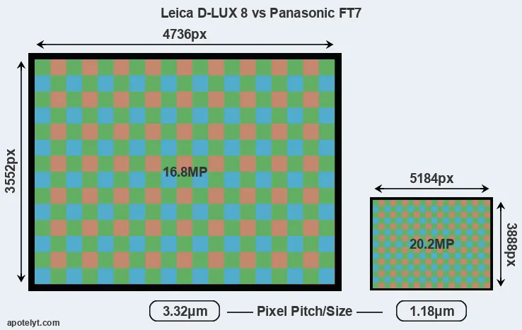 Despite having a smaller sensor, the FT7 offers a higher resolution of 20.2 megapixels, compared with 16.8 MP of the D-LUX 8. This megapixels advantage comes at the cost of a higher pixel density and a smaller size of the individual pixel (with a pixel pitch of 1.18μm versus 3.32μm for the D-LUX 8). Moreover, it should be noted that the D-LUX 8 is much more recent (by 6 years and 1 month) than the FT7, and its sensor will have benefitted from technological advances during this time that further enhance the light gathering capacity of its pixels. Coming back to sensor resolution, it should be mentioned that the D-LUX 8 has no anti-alias filter installed, so that it can capture all the detail its sensor resolves.