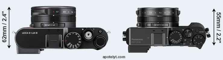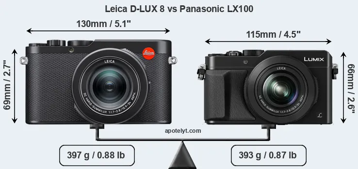 The side-by-side display below illustrates the physical size and weight of the Leica D-LUX 8 and the Panasonic LX100. The two cameras are presented according to their relative size. Three consecutive perspectives from the front, the top, and the back are available. All width, height and depth measures are rounded to the nearest millimeter.