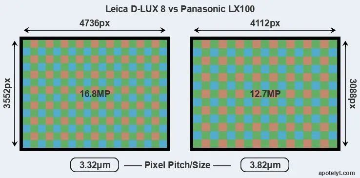 While the two cameras under review share the same sensor size, the D-LUX 8 offers a higher resolution of 16.8 megapixels, compared with 12.7 MP of the LX100. This megapixels advantage translates into a 15 percent gain in linear resolution. On the other hand, these sensor specs imply that the D-LUX 8 has a higher pixel density and a smaller size of the individual pixel (with a pixel pitch of 3.32μm versus 3.82μm for the LX100). In this context, it should be noted, however, that the D-LUX 8 is much more recent (by 9 years and 9 months) than the LX100, and its sensor will have benefitted from technological advances during this time that compensate for the smaller pixel size. Coming back to sensor resolution, it should be mentioned that the D-LUX 8 has no anti-alias filter installed, so that it can capture all the detail its sensor resolves.