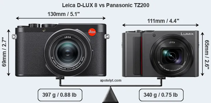 An illustration of the physical size and weight of the Leica D-LUX 8 and the Panasonic TZ200 is provided in the side-by-side display below. The two cameras are presented according to their relative size. Three consecutive perspectives from the front, the top, and the back are available. All width, height and depth measures are rounded to the nearest millimeter.