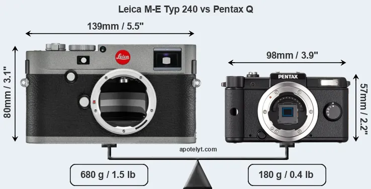If the front view area (width x height) of the cameras is taken as an aggregate measure of their size, the Pentax Q is considerably smaller (50 percent) than the Leica M-E Typ 240. Moreover, the Pentax Q is substantially lighter (74 percent) than the M-E Typ 240. It is worth mentioning in this context that the M-E Typ 240 is splash and dust resistant, while the Pentax Q does not feature any corresponding weather-sealing.