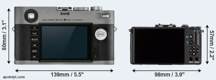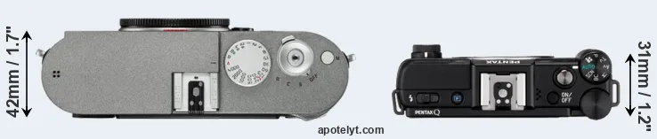 The side-by-side display below illustrates the physical size and weight of the Leica M-E Typ 240 and the Pentax Q. The two cameras are presented according to their relative size. Three consecutive perspectives from the front, the top, and the back are available. All width, height and depth measures are rounded to the nearest millimeter.