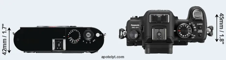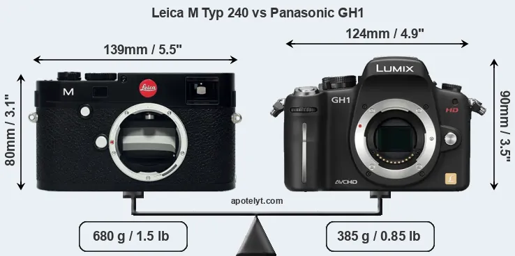 If the front view area (width x height) of the cameras is taken as an aggregate measure of their size, the Leica M Typ 240 and the Panasonic GH1 are of equal size. However, the GH1 is substantially lighter (43 percent) than the M Typ 240. It is worth mentioning in this context that the M Typ 240 is splash and dust resistant, while the GH1 does not feature any corresponding weather-sealing.