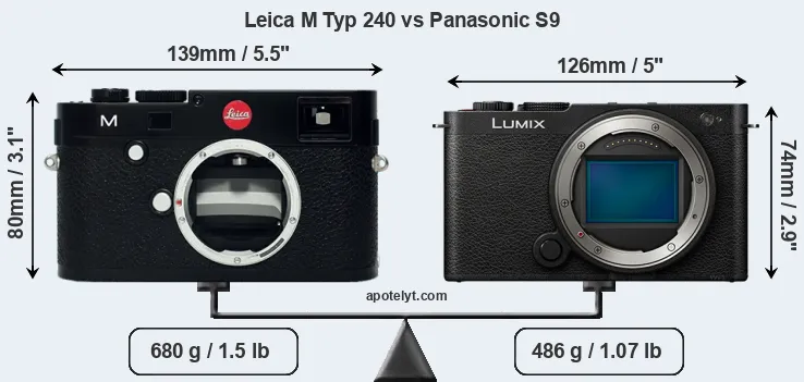 If the front view area (width x height) of the cameras is taken as an aggregate measure of their size, the Panasonic S9 is notably smaller (16 percent) than the Leica M Typ 240. Moreover, the S9 is markedly lighter (29 percent) than the M Typ 240. It is worth mentioning in this context that the M Typ 240 is splash and dust resistant, while the S9 does not feature any corresponding weather-sealing.