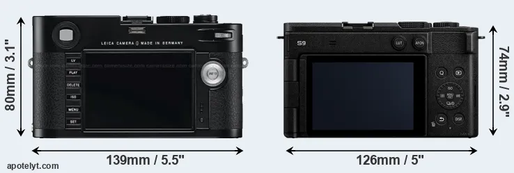 The physical size and weight of the Leica M Typ 240 and the Panasonic S9 are illustrated in the side-by-side display below. The two cameras are presented according to their relative size. Three consecutive views from the front, the top, and the rear side are shown. All width, height and depth dimensions are rounded to the nearest millimeter.
