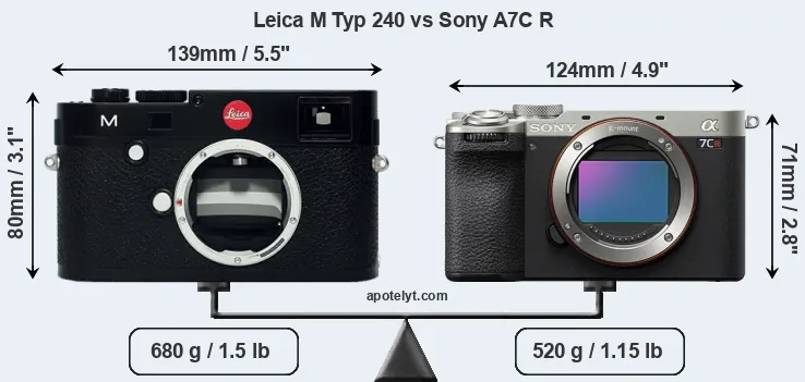 An illustration of the physical size and weight of the Leica M Typ 240 and the Sony A7C R is provided in the side-by-side display below. The two cameras are presented according to their relative size. Three consecutive perspectives from the front, the top, and the back are available. All width, height and depth dimensions are rounded to the nearest millimeter.