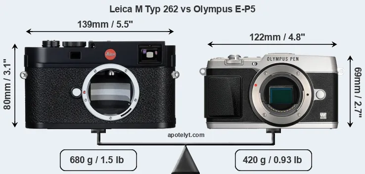The physical size and weight of the Leica M Typ 262 and the Olympus E-P5 are illustrated in the side-by-side display below. The two cameras are presented according to their relative size. Three consecutive perspectives from the front, the top, and the back are available. All width, height and depth dimensions are rounded to the nearest millimeter.