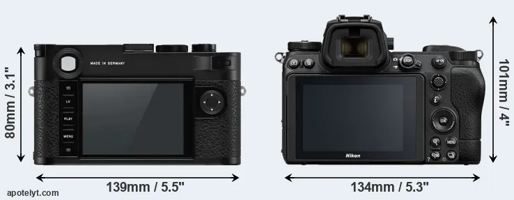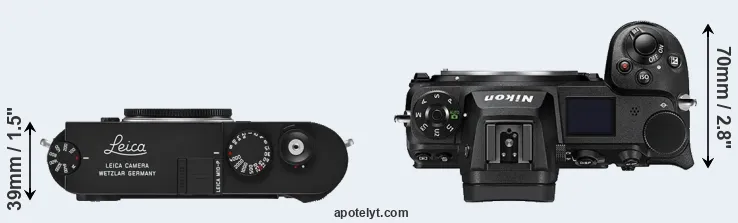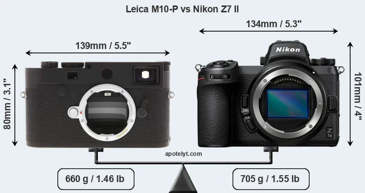 The side-by-side display below illustrates the physical size and weight of the Leica M10-P and the Nikon Z7 II. The two cameras are presented according to their relative size. Three consecutive perspectives from the front, the top, and the back are available. All width, height and depth dimensions are rounded to the nearest millimeter.