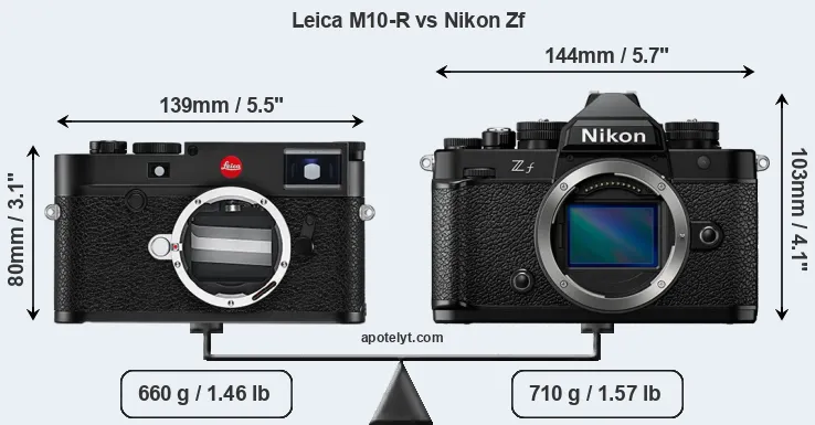 The physical size and weight of the Leica M10-R and the Nikon Zf are illustrated in the side-by-side display below. The two cameras are presented according to their relative size. Three consecutive perspectives from the front, the top, and the back are available. All width, height and depth measures are rounded to the nearest millimeter.