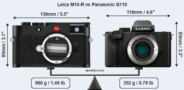 If the front view area (width x height) of the cameras is taken as an aggregate measure of their size, the Panasonic G110 is notably smaller (13 percent) than the Leica M10-R. Moreover, the G110 is substantially lighter (47 percent) than the M10-R. It is worth mentioning in this context that the M10-R is splash and dust resistant, while the G110 does not feature any corresponding weather-sealing.