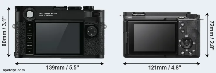 The above size and weight comparisons are to some extent incomplete since they do not consider the interchangeable lenses that both of these cameras require. Both cameras have similarly sized sensors, but DSLRs have a larger flange-to-focal plane distance than mirrorless cameras, which imposes contraints on the optical engineering process and generally leads to bigger and heavier lenses. You can compare the optics available for the two cameras in the Leica M Lens Catalog (M10) and the Sony FE Lens Catalog (ZV-E1).