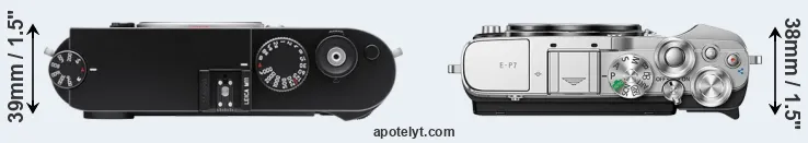 The side-by-side display below illustrates the physical size and weight of the Leica M11 and the Olympus E-P7. The two cameras are presented according to their relative size. Three successive views from the front, the top, and the rear are shown. All size dimensions are rounded to the nearest millimeter.