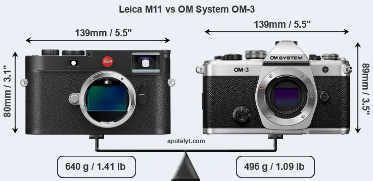 An illustration of the physical size and weight of the Leica M11 and the OM System OM-3 is provided in the side-by-side display below. The two cameras are presented according to their relative size. Three consecutive perspectives from the front, the top, and the back are available. All size dimensions are rounded to the nearest millimeter.