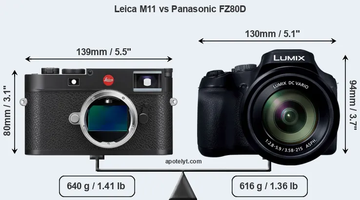 The Leica M11 (Typ 2416) and the Panasonic Lumix DC-FZ80D (labelled Panasonic FZ82D in some countries) are two digital cameras that were announced, respectively, in January 2022 and July 2024. The M11 is a rangefinder-focusing mirrorless camera, while the FZ80D is a fixed lens compact. The cameras are based on a full frame (M11) and a 1/2.3-inch (FZ80D) sensor. The Leica has a resolution of 60.3 megapixels, whereas the Panasonic provides 18 MP.