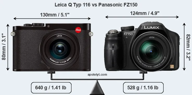 If the front view area (width x height) of the cameras is taken as an aggregate measure of their size, the Panasonic FZ150 is somewhat smaller (2 percent) than the Leica Q Typ 116. Moreover, the FZ150 is markedly lighter (18 percent) than the Q Typ 116. In this context, it is worth noting that neither the Q Typ 116 nor the FZ150 are weather-sealed.