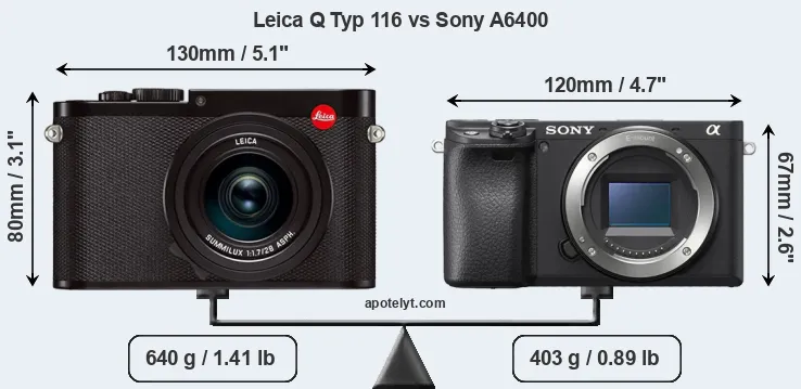 If the front view area (width x height) of the cameras is taken as an aggregate measure of their size, the Sony A6400 is notably smaller (23 percent) than the Leica Q Typ 116. It is noteworthy in this context that the A6400 is splash and dust-proof, while the Q Typ 116 does not feature any corresponding weather-sealing.