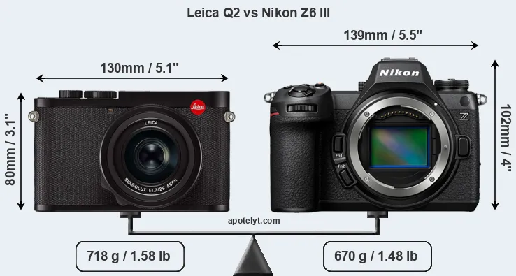 The side-by-side display below illustrates the physical size and weight of the Leica Q2 and the Nikon Z6 III. The two cameras are presented according to their relative size. Three successive views from the front, the top, and the rear are shown. All width, height and depth dimensions are rounded to the nearest millimeter.