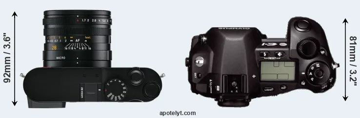 An illustration of the physical size and weight of the Leica Q2 and the Olympus E-1 is provided in the side-by-side display below. The two cameras are presented according to their relative size. Three consecutive perspectives from the front, the top, and the back are available. All width, height and depth dimensions are rounded to the nearest millimeter.