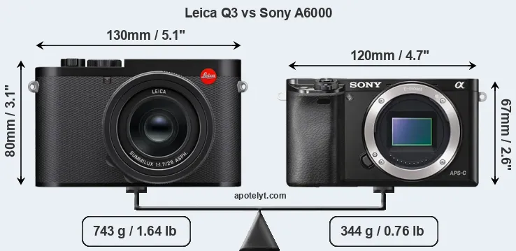 If the front view area (width x height) of the cameras is taken as an aggregate measure of their size, the Sony A6000 is notably smaller (23 percent) than the Leica Q3. It is worth mentioning in this context that the Q3 is splash and dust resistant, while the A6000 does not feature any corresponding weather-sealing.