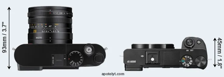 The physical size and weight of the Leica Q3 and the Sony A6000 are illustrated in the side-by-side display below. The two cameras are presented according to their relative size. Three consecutive perspectives from the front, the top, and the back are available. All size dimensions are rounded to the nearest millimeter.
